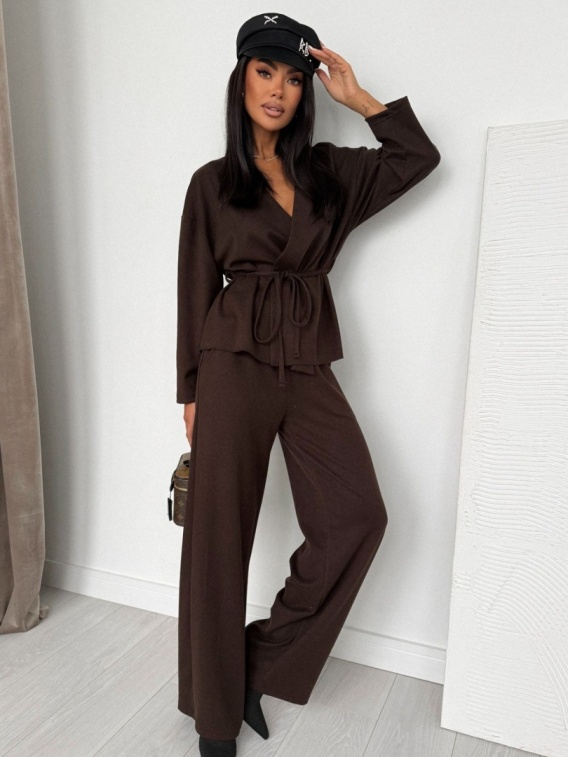 Elegancki i komfortowy komplet z dzianiny bawełnianej, góra przewiązywana paskiem. Spodnie z szerokimi nogawkami, z kieszeniami. W pasie guma. Bez ocieplenia.